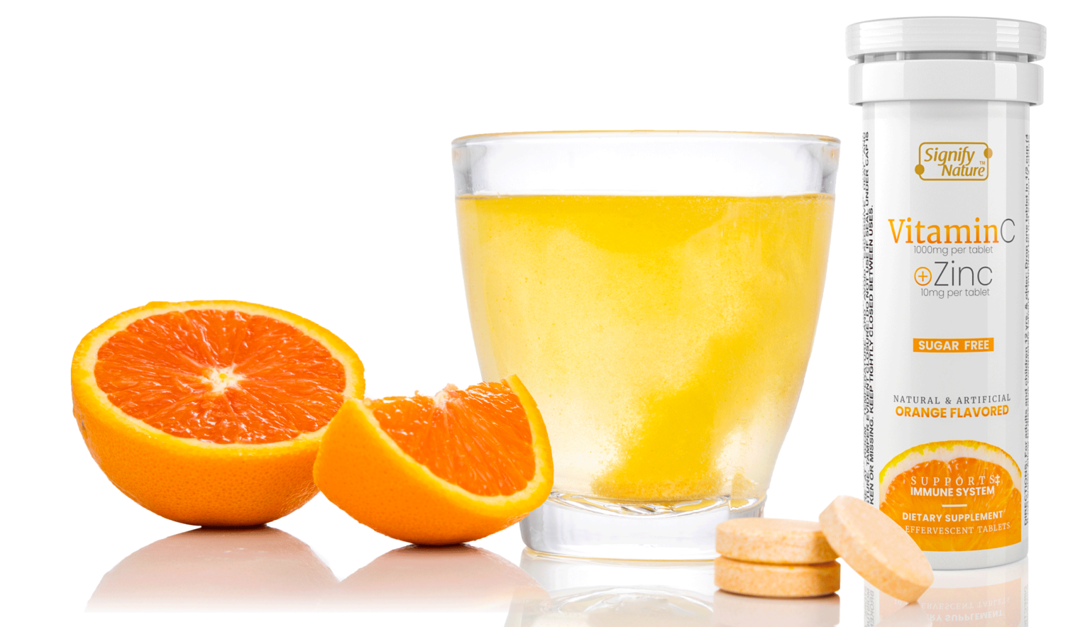Immune system booster. This daily immune support sugar free vitamin C powder zinc tablet is a POWERFUL COMBINATION. Our dissolvable zinc tablets contain more Vitamin C than 10 oranges and more Zinc than 15 eggs. This vit c 1000mg plus zink makes the perfect blend to provide an immune boost. Perfect vitamins for immune system support. Enjoy it as a delicious and refreshing vitamin c drink or as a soothing immune support tea*